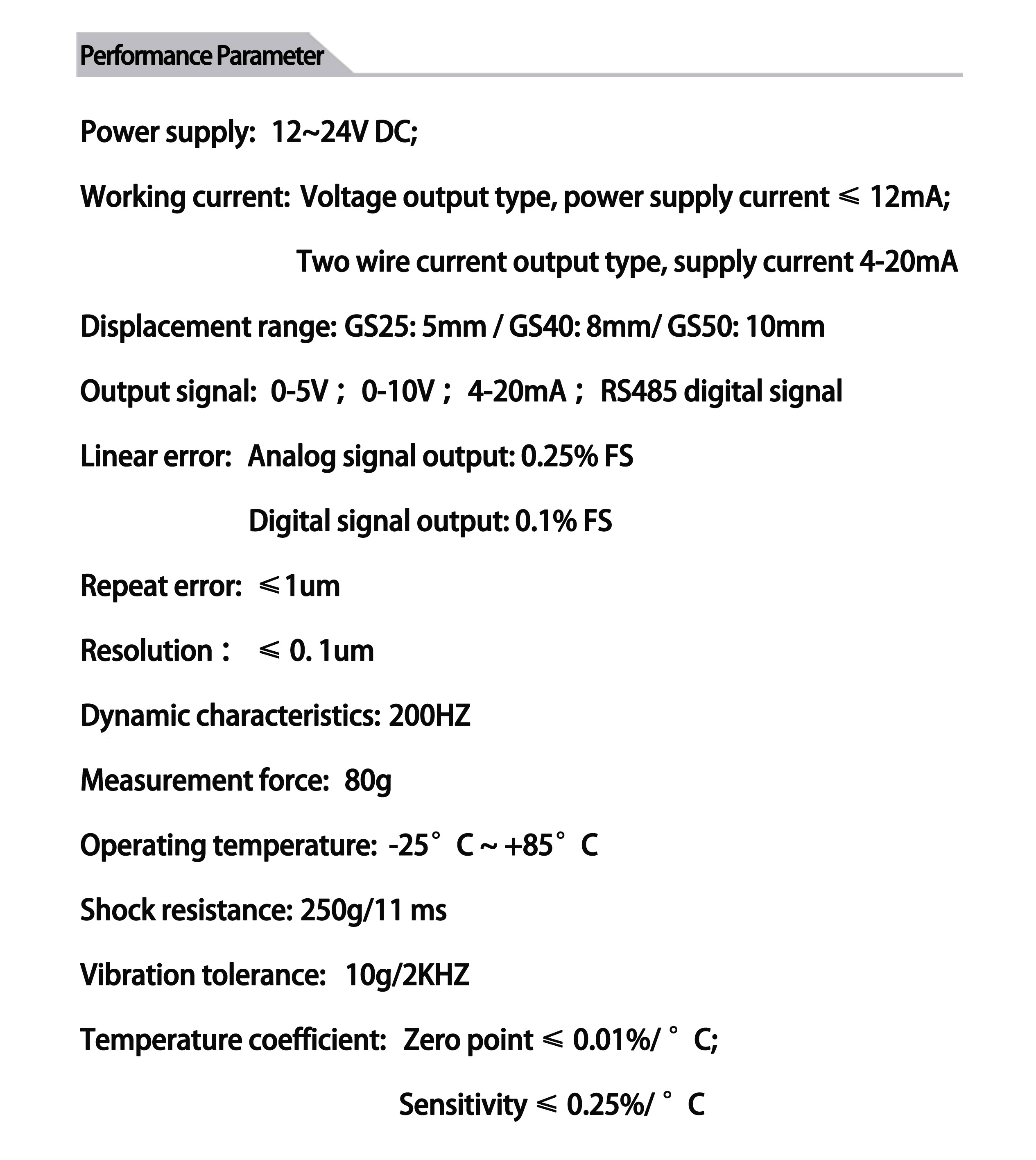 Zero point ≤ 0.01%/ ° C; Sensitivity ≤ 0.25%/ ° C? |