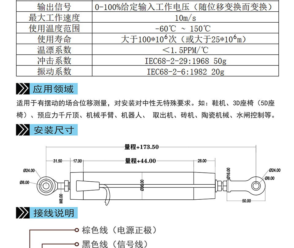 主要應(yīng)用領(lǐng)域:KPC絞接式直線位移傳感器,兩端魚眼萬向節(jié)絞接,適用于有擺動的場合位移測量,對安裝對中性無特殊要求。如:鞋機、3D座椅(5D座椅)、預(yù)應(yīng)力千斤頂、機械手臂、機器人、 取出機、磚機、陶瓷機械、水閘控制等。